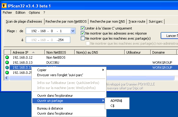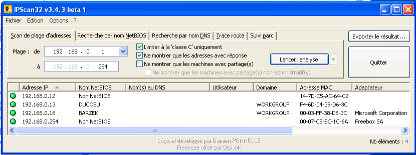 Pour le savoir c’est simple il suffit de se procurer le très bon logiciel IPScan32 qui se trouve ici