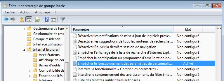 – Parcourez les dossiers Stratégie Ordinateur Local / Configuration Ordinateur /Modèles d’administration / Composants Windows / Internet Explorer